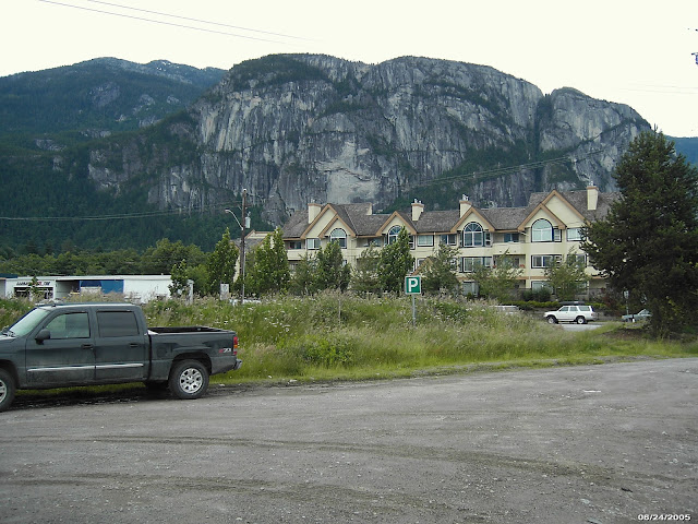 So Bill and I traveled north having no idea what lay ahead. It was very pleasant, more than pleasant, it was adventure in a land of the unknown. We soon came upon our first road delay. 10 minute wait and, once underway, 6 miles of dirt road behind a pilot car over a graveled road. That, it turns out, is how it is usually done in Canada and Alaska....no big deal. We traveled on to Squamish, and Bill and I were ready to call it a day. Squamish is at the head of horseshoe bay and a gateway to a hundred miles of area to the northwest, or in the northeast direction with much mtn sports of all types. Whistler's up there for instance.